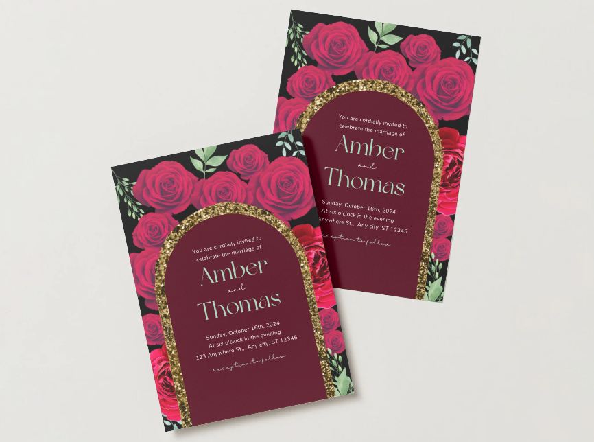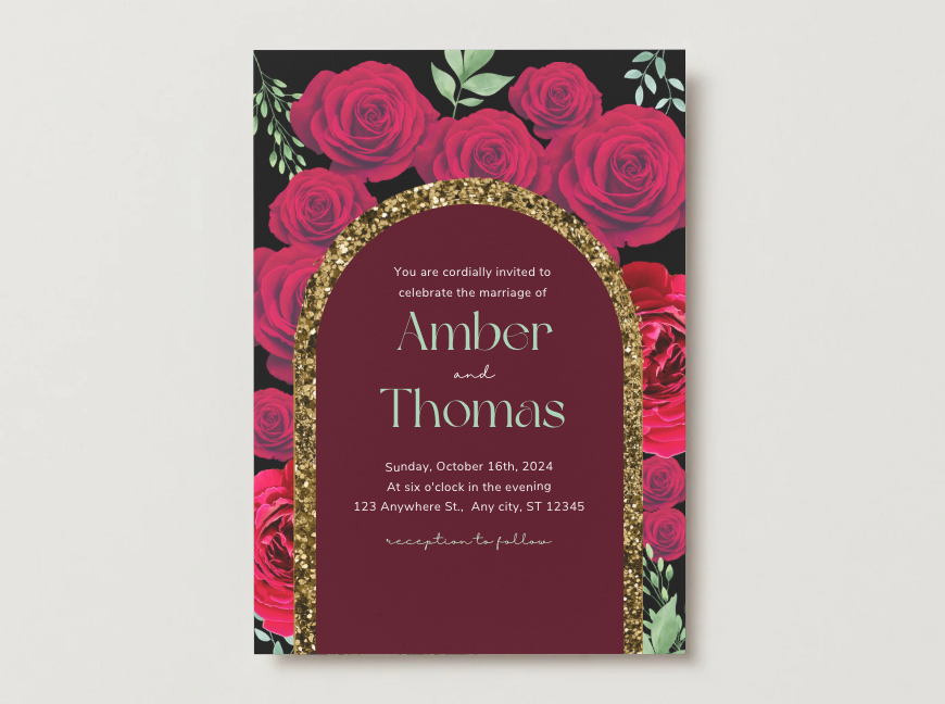 Create a bold and modern first impression with this Burgundy & Gold Arch Wedding Invitation. Deep burgundy tones, shimmering gold accents, and red rose florals come together in a contemporary arch layout that’s perfect for chic weddings and evening celebrations.