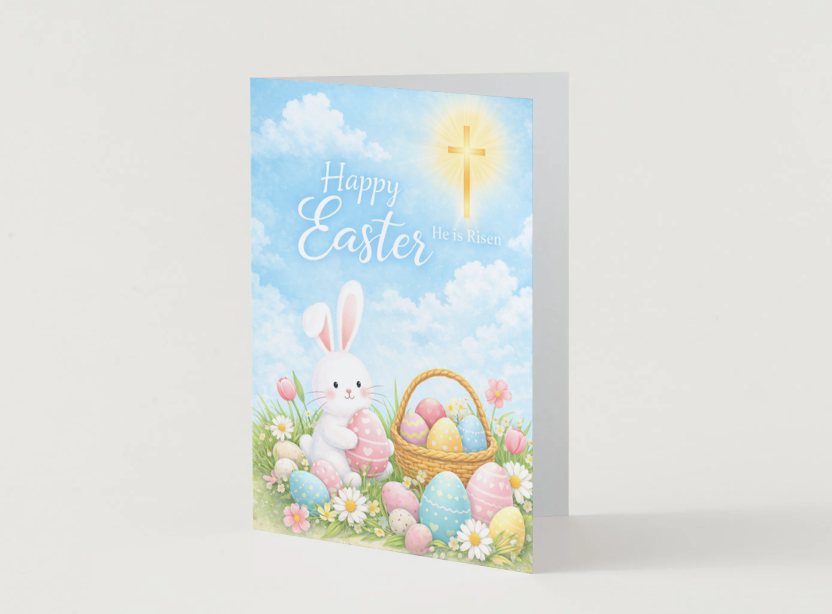 Celebrate Easter with a peaceful and uplifting printable Easter card that beautifully blends faith and springtime charm. This design features a soft sky backdrop with a glowing cross and the message “He is Risen,” paired with a sweet bunny, pastel eggs, and blooming flowers.