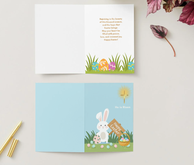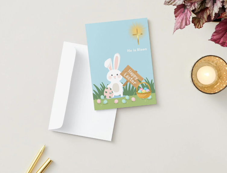 Paired with a soft spring scene including a gentle bunny, Easter eggs, and a basket, this card blends warmth and faith into a meaningful and heartfelt greeting. It is perfect for sharing with family, friends, church members, or anyone who celebrates the resurrection and message of Easter.