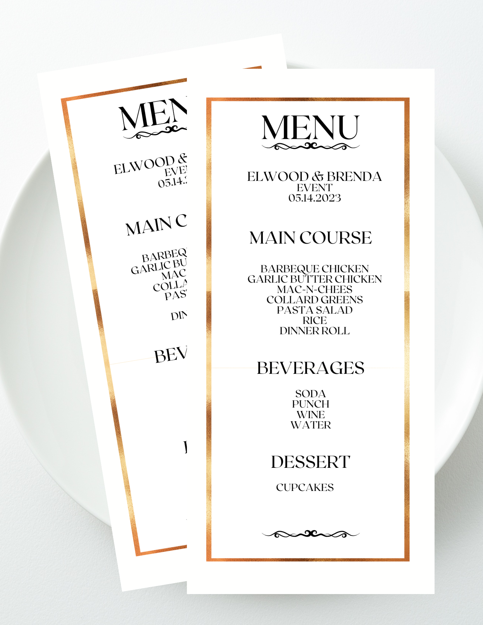 Elevate your event with this elegant 4×9 inch printable menu template, designed to bring a polished and professional look to any table setting. Whether you’re hosting a wedding reception, rehearsal dinner, anniversary celebration, birthday party, corporate banquet, baby shower, holiday gathering, or private dinner event, this versatile menu design complements both formal and casual occasions.