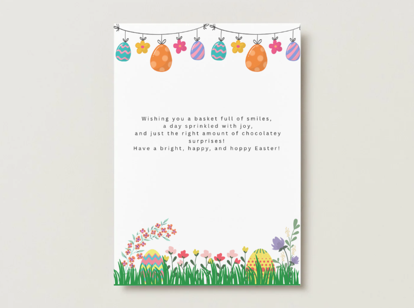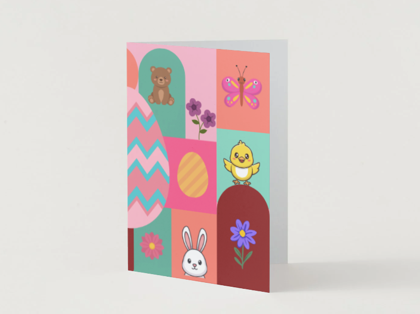 Celebrate Easter with this adorable and playful printable Easter card! Designed with bright pastel colors and charming spring icons like bunnies, chicks, eggs, flowers, and butterflies, this card brings joy and whimsy to any Easter celebration.