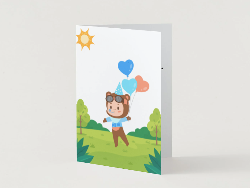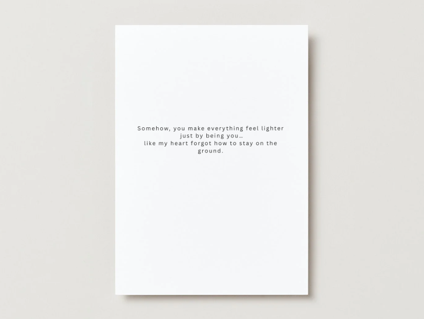 Celebrate love in a fun, lighthearted way with this adorable balloon themed greeting card. Featuring a charming character floating with heart shaped balloons, this design pairs perfectly with the heartfelt message “Somehow, you make everything feel lighter just by being you.”