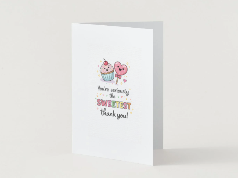 Say thank you in the sweetest way possible with this adorable dessert themed greeting card! Featuring a smiling cupcake and heart shaped lollipop, this playful design is paired with the message “You’re seriously the sweetest, thank you!” perfect for expressing appreciation with a fun and heartfelt touch.