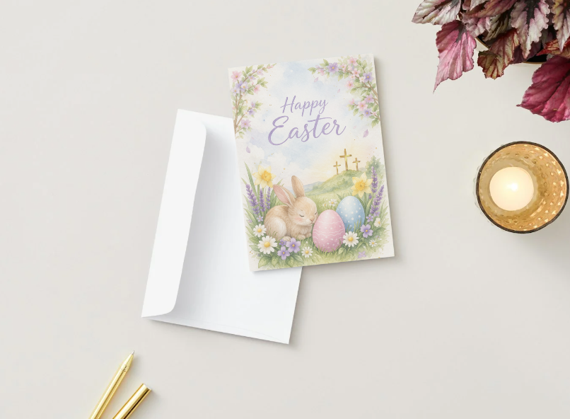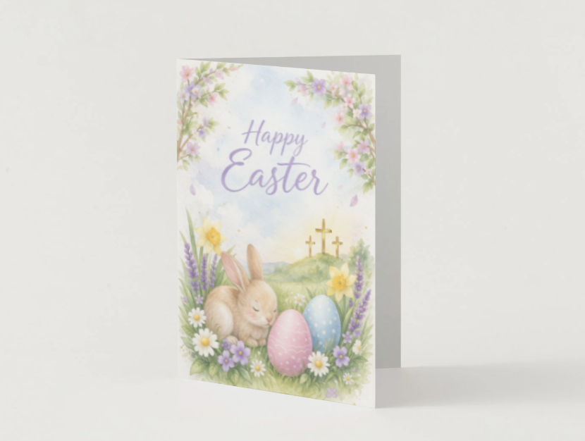 Celebrate Easter with elegance and meaning using this beautifully designed watercolor Easter card. Featuring a soft and serene illustration of a gentle bunny surrounded by spring florals, pastel eggs, and a peaceful cross scene in the distance, this card captures both the beauty and spiritual significance of the season.