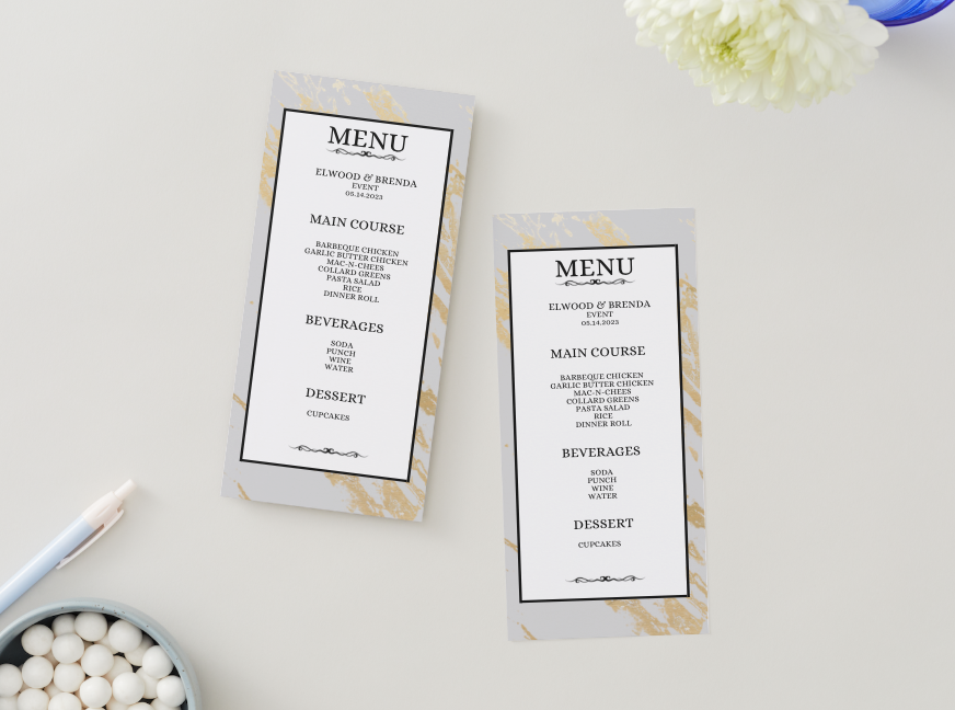 Elevate your event with this elegant 4×9 inch printable menu template, designed to bring a polished and professional look to any table setting. Whether you’re hosting a wedding reception, rehearsal dinner, anniversary celebration, birthday party, corporate banquet, baby shower, holiday gathering, or private dinner event, this versatile menu design complements both formal and casual occasions.