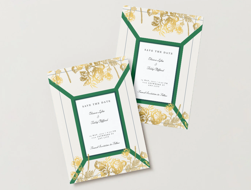 Announce your wedding date with this Green & Gold Floral Announcement card, featuring a classic geometric frame and lush vintage inspired florals. The rich green and gold palette adds a luxurious touch to any wedding theme.
