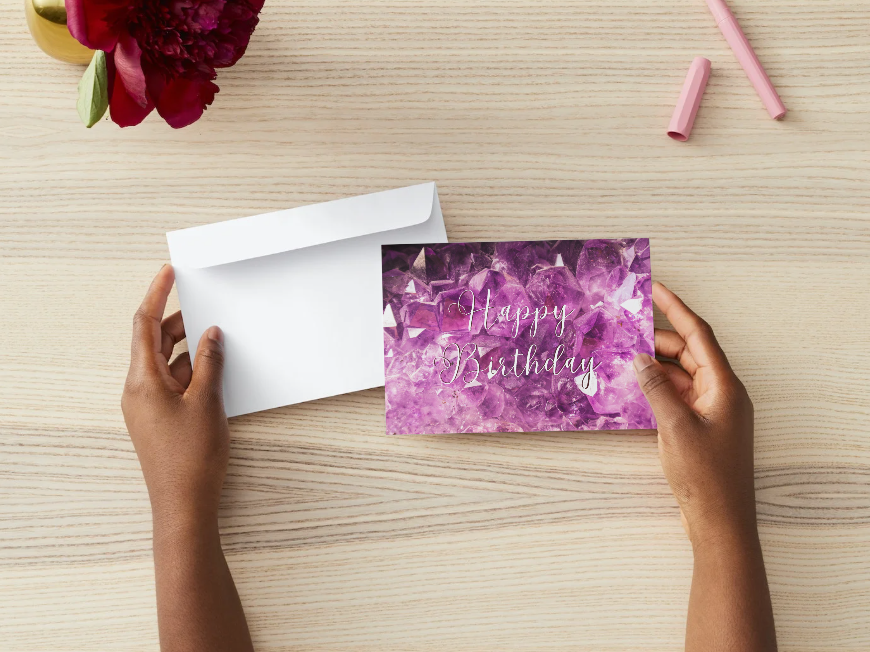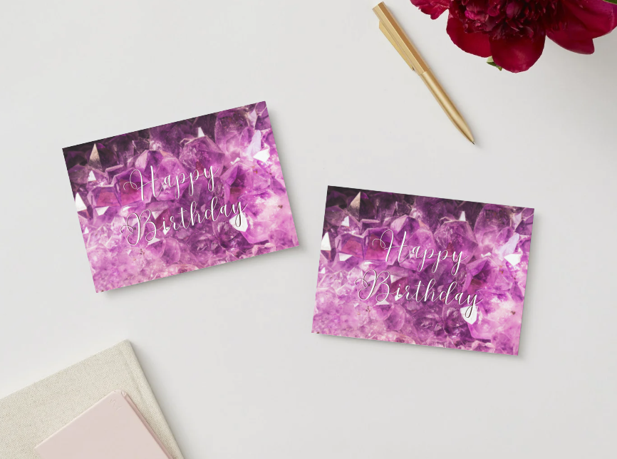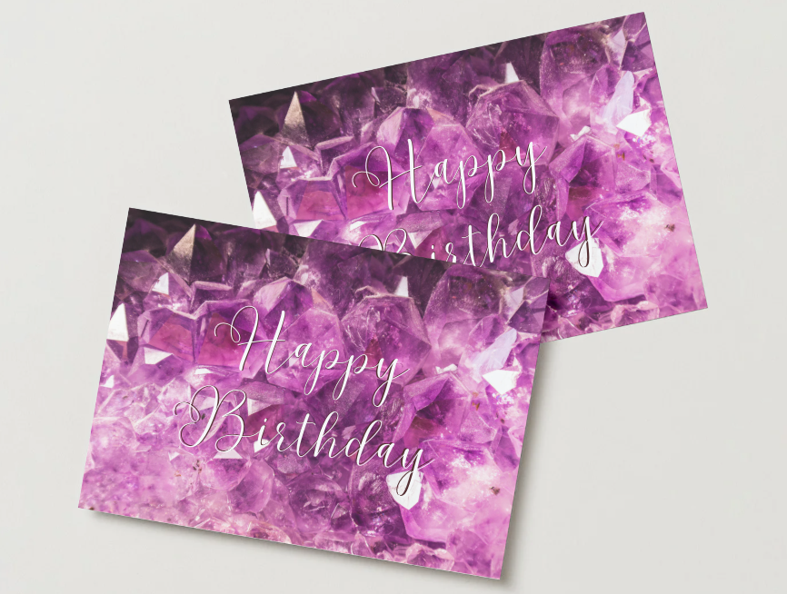 This printable birthday card features a striking amethyst inspired background paired with elegant typography. Ideal for milestone birthdays or anyone who loves a dramatic, modern aesthetic.