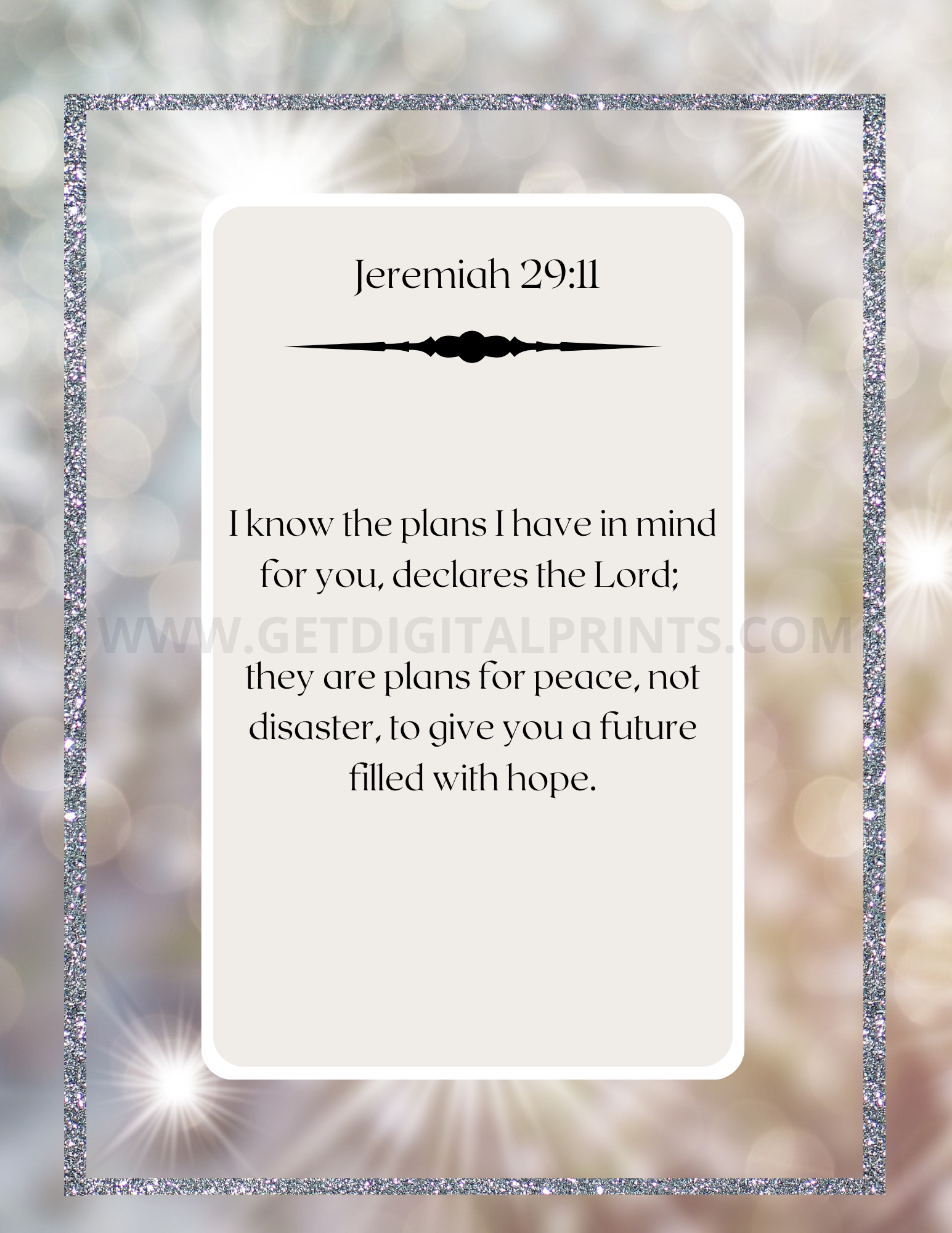 This Jeremiah 29:11 Christian wall art features a shimmering border with a clean, modern Scripture layout. Designed to uplift and inspire, this printable artwork reminds believers of God’s promise for hope, peace, and a future filled with purpose. Perfect for home décor, church offices, and prayer rooms.