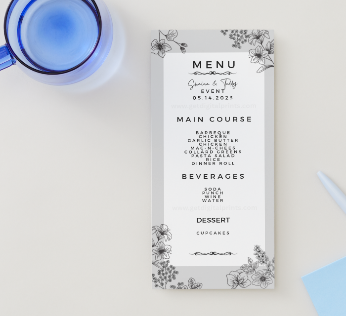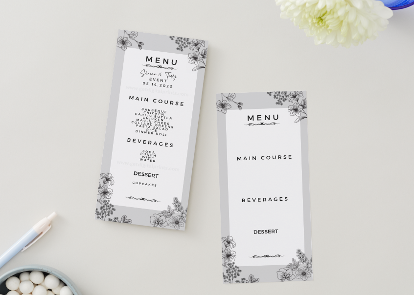 Create a beautiful and organized dining experience with this elegant 4×9 customizable event menu template. Designed with a timeless black and white floral border and minimalist typography, this menu adds a refined and sophisticated touch to any celebration.