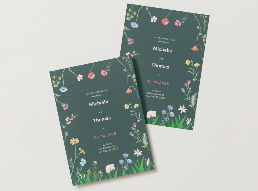 The petite floral details create visual interest without overwhelming the layout, allowing your wedding information to remain clear and beautifully framed. This design is ideal for outdoor weddings, spring or summer ceremonies, bridal showers, and intimate celebrations where softness and charm take center stage.