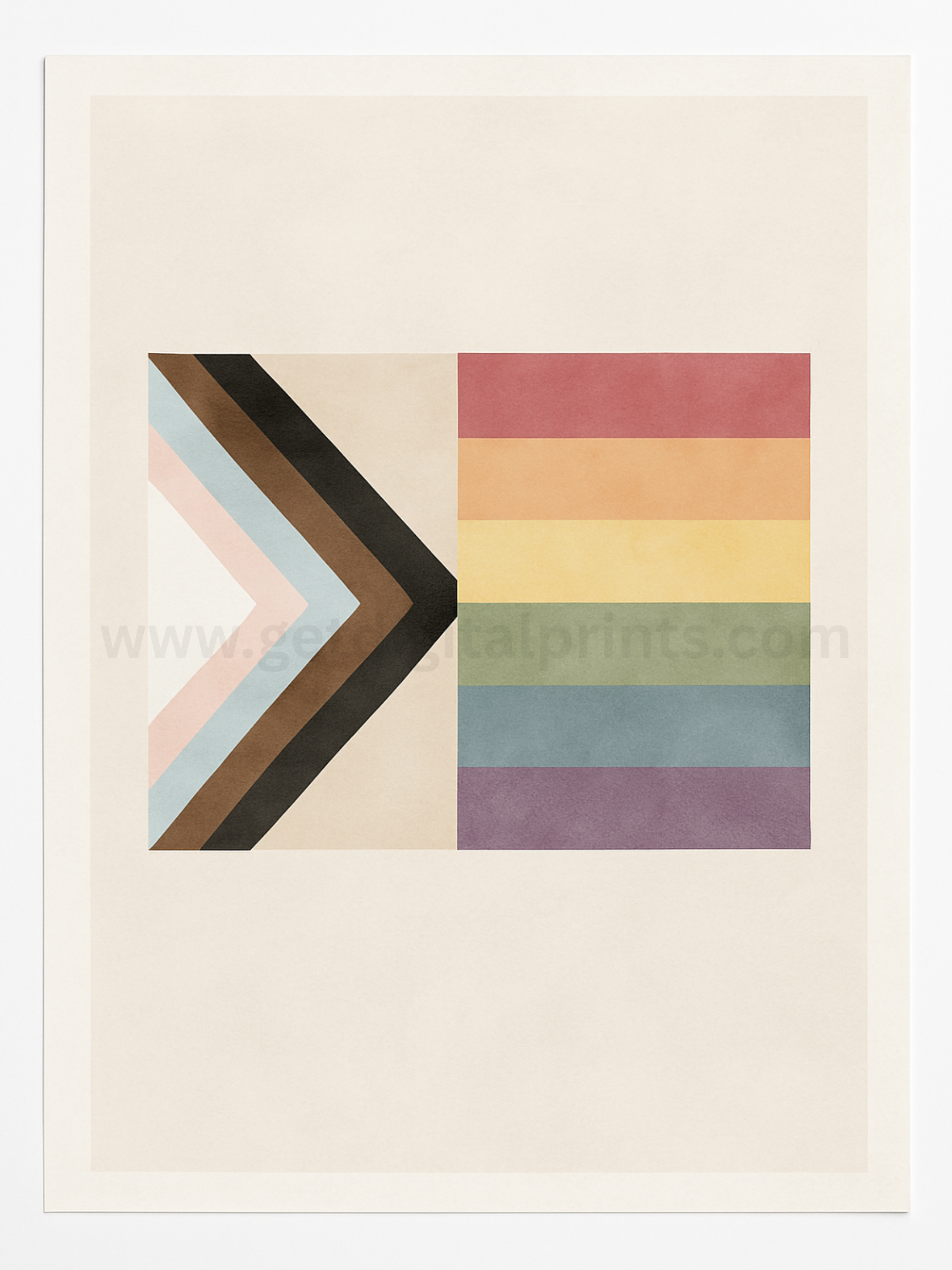 Celebrate identity, diversity, and unity with this minimalist Progress Pride flag art print. Designed in soft, muted watercolor tones, this piece brings a modern and elegant touch to any space while honoring LGBTQ+ inclusivity.
