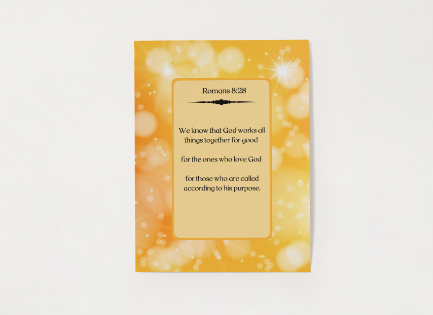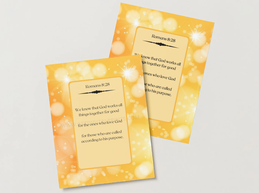This uplifting Romans 8:28 Scripture poster features a warm golden glow design symbolizing hope, purpose, and divine alignment. Excellent for spiritual décor, gifts, and daily encouragement. Delivered as a printable digital download.