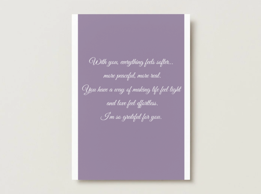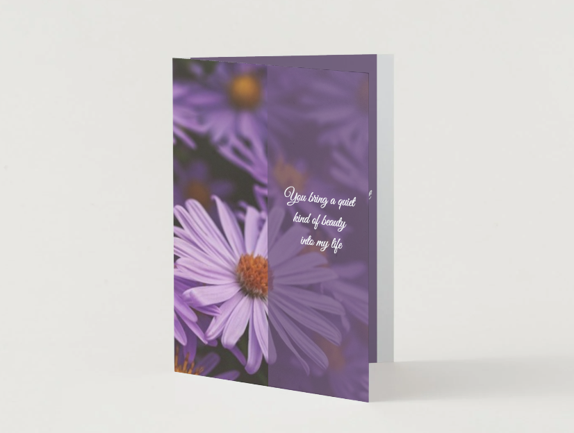 Celebrate love in its most gentle and meaningful form with this elegant purple floral greeting card. Featuring a soft focus flower design and the heartfelt message “You bring a quiet kind of beauty into my life,” this card captures a sense of calm, appreciation, and emotional connection.