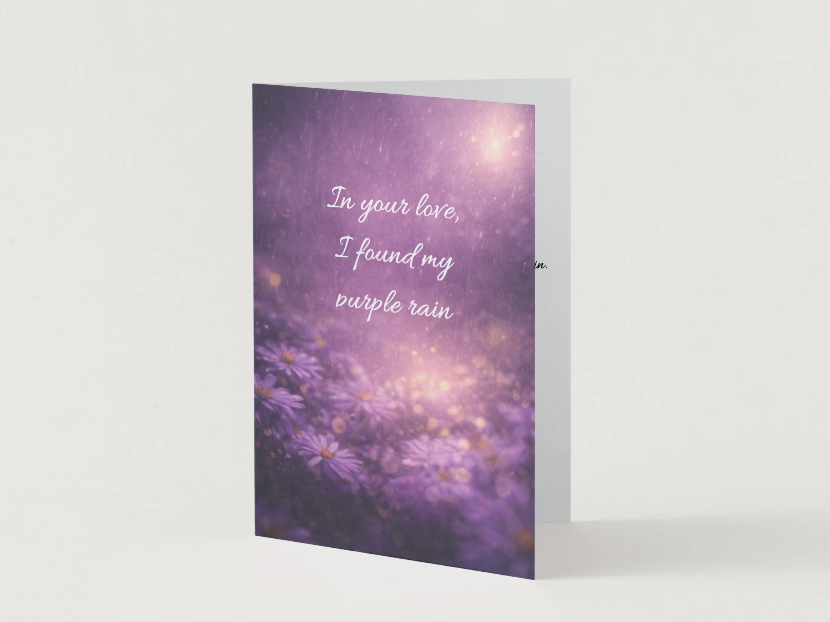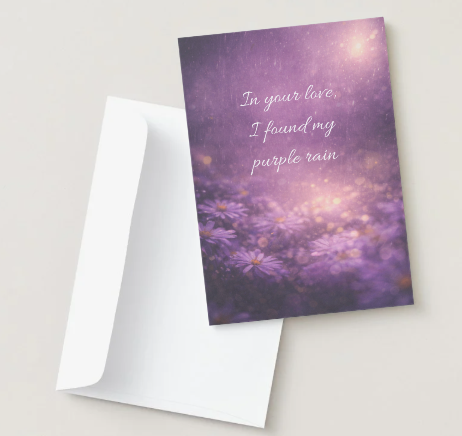 Express your love in a beautifully poetic and emotional way with this dreamy purple themed greeting card. Featuring a soft, glowing floral background and the romantic message “In your love, I found my purple rain,” this design captures a sense of peace, passion, and deep connection.