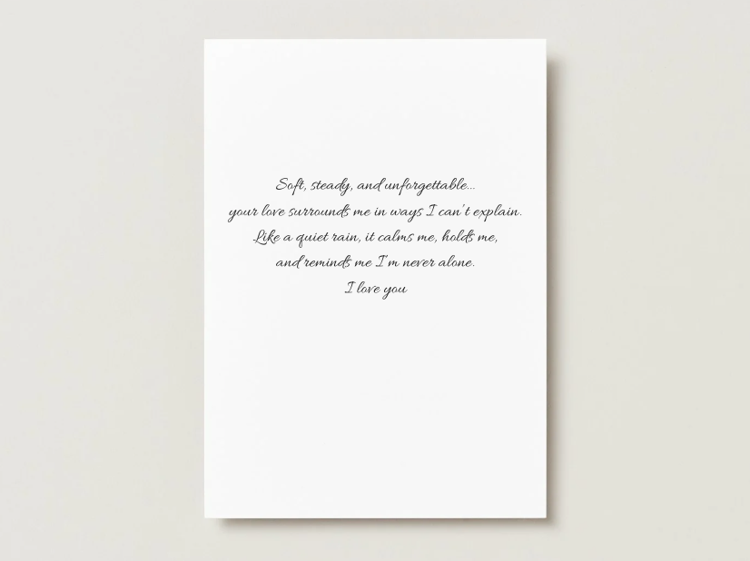 Inspired by the feeling of gentle rain and nostalgic romance, this card is perfect for those who want to express love in a meaningful and artistic way. The rich purple tones, soft lighting, and elegant script typography create a calming yet powerful visual that makes this card truly unforgettable.