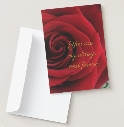 Express your love in a timeless and elegant way with this romantic rose themed greeting card. Featuring a stunning close up of a deep red rose and the heartfelt message “You are my always and forever,” this design captures the beauty and depth of true love.