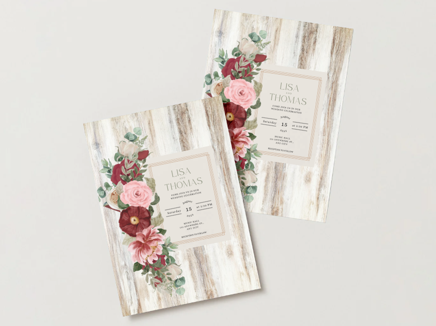 This rustic floral wood wedding invitation is designed for couples who love timeless charm blended with natural elegance. Featuring a realistic wood grain background paired with soft floral arrangements, this invitation captures the warmth and romance of a countryside celebration. The balanced layout offers clear event details while maintaining an elevated, handcrafted feel that works beautifully for barn weddings, vineyard ceremonies, garden venues, and outdoor celebrations.