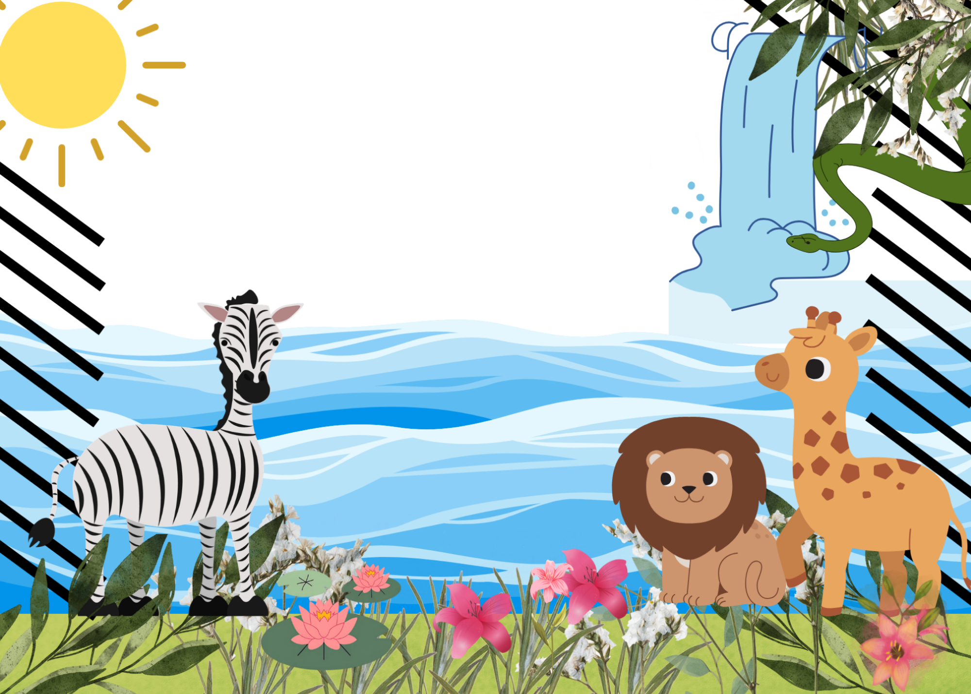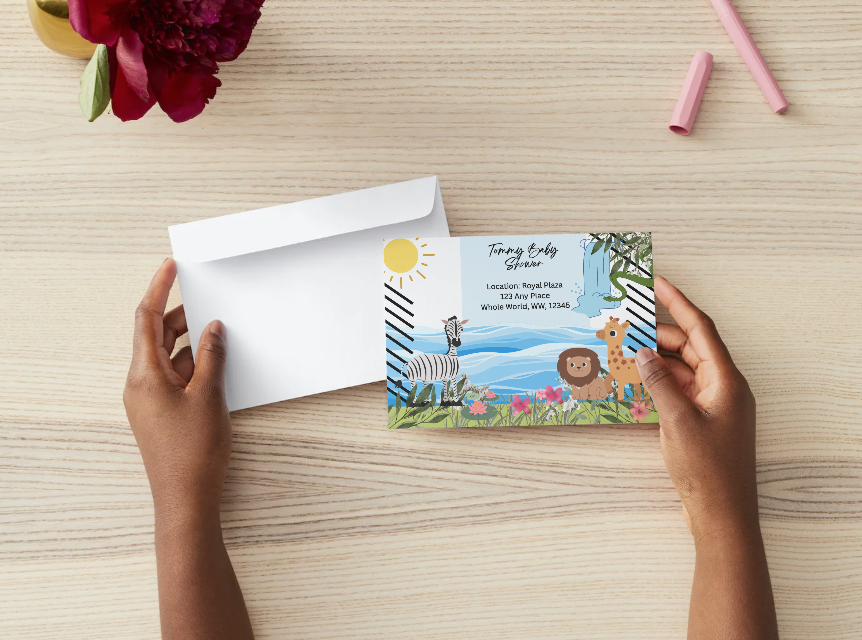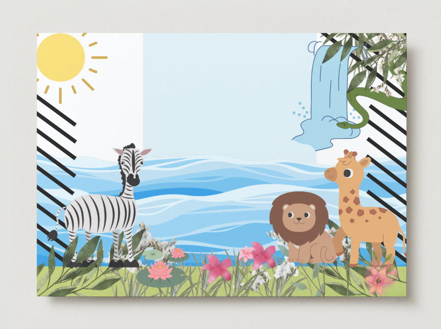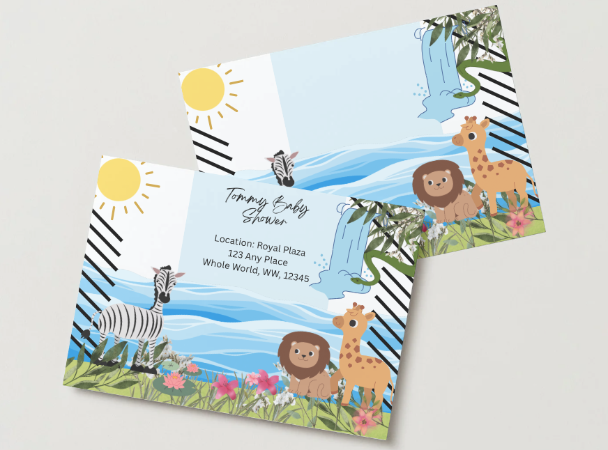 Celebrate your little one in style with this charming 7×5 inch jungle safari baby shower or birthday card template. Designed with playful yet elegant details, this printable card features a cheerful zebra, lion, and giraffe set against flowing blue water, lush greenery, and soft floral accents creating a warm and whimsical atmosphere perfect for any child centered celebration.